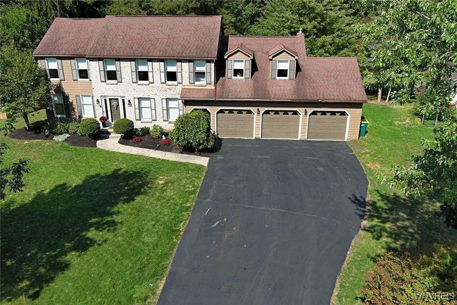 Stunning 3,339 sq. ft. Colonial tucked away on a quiet cul-de-sac in the sought-after Williamsville School District! This 5-bedroom, 3 full bath home offers an impressive layout with a handicap- accessible first-floor bath. Enjoy a formal living and dining room plus a cozy family room featuring a wood--burning fireplace with a gas start. The gourmet kitchen is a chef's dream with cherry soft-close cabinetry, granite countertops, double oven, beverage center, two sinks, two dishwashers, a large island, and bamboo flooring. Sliding glass doors lead to a spacious deck overlooking a private backyard with wooded views. Upstairs, the oversized primary suite includes its own bath and walk-in closet, while all additional bedrooms are generously sized. A 3.5 car garage provides exceptional storage. The finished dry basement features a workshop, storage galore, two sump pumps, central vac, and updated mechanicals including a 2-year-old furnace, central air, and hot water tank. Truly a remarkable home built for comfort, entertaining, and everyday living! Sellers may need to rent back for a couple of weeks as they are relocating.