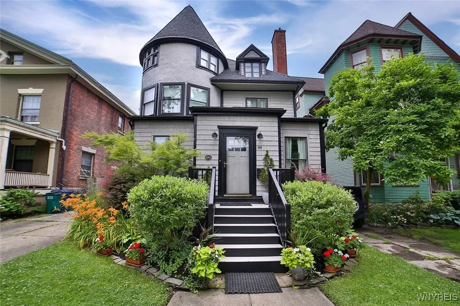 This exceptional Elmwood Village Victorian is an unmatched combination of classic, traditional curb appeal and thoughtful, artistic modern interior design. Stucco and shingle exterior with distinctive turret and welcoming front porch opens to large entryway room with built in bookshelves and extensive closet space. Fantastic open floor plan layout offers spacious living room featuring brick woodburning fireplace (NRTC), floor to ceiling all-new windows for incredible natural light, gleaming maple hardwood floors, curved wall detailing perfect for art display, and more. Modern fully applianced kitchen with designated dining area boasts modern fixtures, expansive cabinetry, oversized sink, and brick detail. Glass doors lead to a gorgeous raised deck, the perfect transition for indoor/outdoor entertaining! Primary suite stuns with fireplace (NRTC) in sitting area, curved wall to mirror exte...