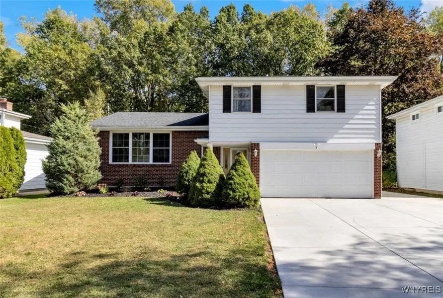 Bright, spacious and inviting - this brick-front split-level home showcases modern touches and thoughtful updates, creating a move-in-ready space perfect for everyday living and entertaining. On the main level, the updated kitchen (2023) features butcher block countertops w/a single-bay sink and sprayer, tile backsplash, white cabinetry w/matte black pulls, pantry and suite of stainless steel appliances. A breakfast bar overlooks the family room below, creating a connected, open feel. The dining and main living areas provide a bright, welcoming atmosphere, enhanced by hardwood flooring and modern light fixtures. Upstairs, all three bedrooms feature vinyl plank flooring, while the main full bath includes a tiled walk-in shower, solid-surface vanity and linen storage. The primary suite includes double closets, ceiling fan and a modern, yet timeless, updated bath (2024) w/a double sink, quartz-topped vanity, vinyl plank flooring, standalone soaking tub and tiled walk-in shower. On the entry level, the family room and half bath provide additional living space along w/direct access to a covered concrete patio and fully fenced backyard. In 2023, a roof and covered area were added to the existing concrete patio, including ceiling fans, lighting and electric, creating a comfortable space for seasonal enjoyment. The fully fenced backyard includes two sheds and gated access to the wooded area behind, while the basement provides versatile bonus space w/ceramic tile flooring, glass block windows, sump pump (2023) as well as laundry and ample storage. Additional upgrades include a brand-new triple-wide concrete driveway (6/2025) w/extra parking pad (32x8), providing plenty of room for an RV, work truck or additional vehicles and toys along w/a newly poured front porch. The attached two-car garage features a commercial-grade gas heater (2024), while mechanical updates include boiler (2012) w/new pump (2024) and hot water tank (2012) as well as an architectural roof (2015). Updated, functional and full of light - this home is easy to love!! Showings begin Saturday, 10/11 @ 10am. Offers are due Thursday, 10/16 @ 1pm.