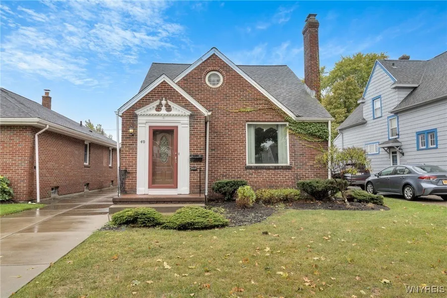 Welcome to this timeless brick Cape in the heart of Kenmore, a home showcasing the craftsmanship and enduring architectural charm of its era. From the detailed brickwork and full brick garage to the stately front entry, every detail reflects character and quality. Inside, the bright living room features a brick-surround wood-burning fireplace alongside a large picture window filling the space w/natural light. The kitchen opens to the dining area and includes oak cabinetry and a suite of appliances, in addition to a peninsula that separates the cooking space from the dining area. Two first-floor bedrooms offer hardwood floors (under carpeting) and ample closet space - one w/dual closets. The hallway includes a built-in linen closet, while the full bath features the original tub w/full tile surround, tile flooring and linen closet. Upstairs, two generously sized bedrooms offer deep closets, accompanied by a half bath accented w/a charming circular window and convenient eave storage. The basement provides versatile bonus areas w/built-ins, a wet bar and laundry room w/washer and dryer included. Upgrades include boiler (2020), hot water tank (2020), 100amp electrical service, newer concrete driveway, architectural roof and sump pump as well as vinyl replacement windows throughout. Set on an unusually deep lot for Kenmore, this solid brick Cape combines classic character w/the potential for updates, offering a home that's ready to be refreshed and personalized! Conveniently located near major amenities, restaurants and more - it's the ideal blend of charm, space and accessibility.