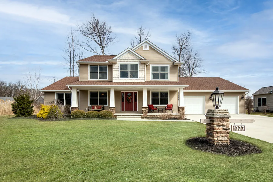 Welcome to 1073 Wayne Trail! Nestled in the highly coveted Indian Ridge Estates, this newer build offers all of the modern touches you have been seeking such as floor plan, stately front elevation, and exterior features that would make any backyard entertainer excited to host. As you make your way through the front door you are greeted by the two-story foyer and sharp staircase. French doors make way to a quiet office space, opposite the quaint dining room. The open floor plan is highlighted by the enormous kitchen w/ professional appliances, granite island w/ gas range, and breakfast nook. Convenience of a first-floor owners suite w/ en-suite rounds out the first level. The second level offers 3 additional large bedrooms and full bath. Additional items to note: 4 foam insulation and sound barrier in walls throughout, whole home gas powered generator, exterior stamped concrete patio w/ fire pit, built in seating, lighting, bar w/ granite countertops, and built-in gas grill. Do not miss out on this one-of-a-kind opportunity near the lake!