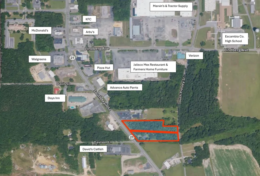 Located .3 miles north of the Alabama - Florida state line in Atmore Alabama, lies approximately 4.3 acres of flat partially developed land. The property is currently zoned B2 and R1 and public utilities are available. The property sits in between two major roads. The western side of the property fronts Highway 21 South and the eastern side fronts S. Presley St. The subject property is 8 miles south of Wind Creek Casino. There is approximately 375 feet of Highway 21 frontage and 210 feet on S. Presley St. Several businesses are located less than a stones throw away. Businesses like restaurants, hotels, pharmacies, banks, car dealerships, etc. Davids Catfish, a local favorite, is across the street. A 2023 traffic count is available upon request. Give Bill a call to schedule your viewing.