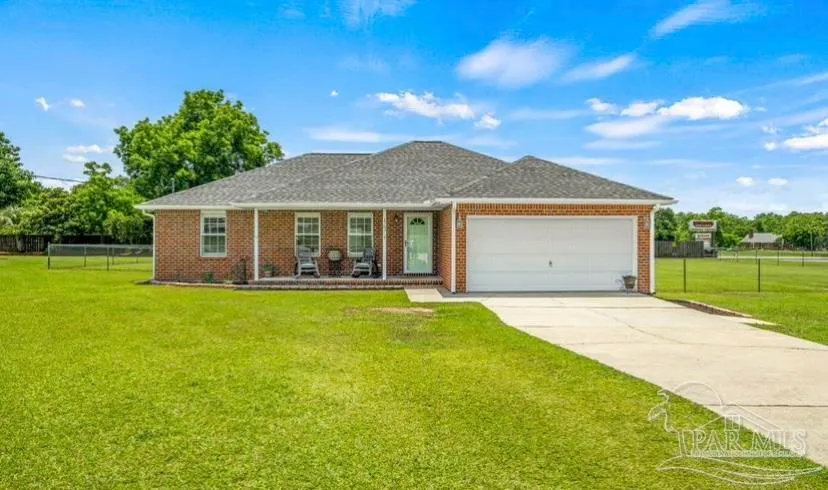 Welcome to your little piece of paradise in Molino. This beautiful 3 bedroom 2 bathroom home is all brick with a 2 car garage. This home sits on a generous 1-acre lot with a front porch and a covered back patio looking over a well-maintained yard that is fully fenced with a matching cottage-style storage building. As you step in you will be greeted with a light and bright living room. The dining room will lead into a gorgeous kitchen that has been updated with quartz countertops, tile backsplash, new stainless stove with double ovens, new sink with touch faucet, and a new disposal with push button activation. The master bedroom has an en suite with an updated tile shower, dual vanities, and a walk-in closet. All other features include a new roof (May 22, 2023), new HVAC, new hot water heater, plantation shutters throughout, LVP in bedrooms, master bath, and closet. Call for your private showing and don't miss out on this property!!