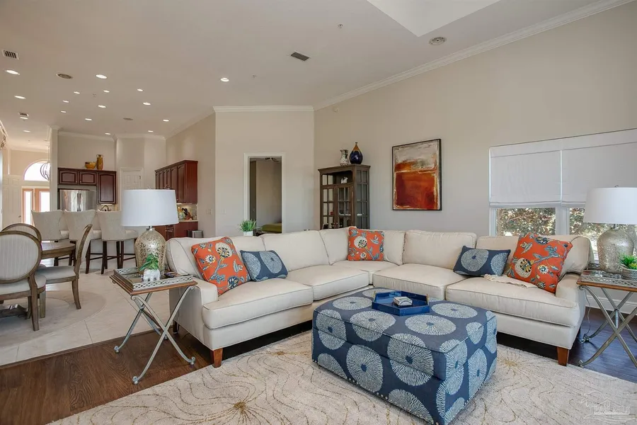 THE PERFECT ISLAND HOME ALONG PERDIDO KEY'S INTRACOASTAL WATERWAY NESTLED AMONGST BEAUTIFUL OAK, PALM AND MAGNOLIA TREES WITH A WONDERFUL ‘RESIDENTIAL FEEL' – RIVER COLONY OFFERS TRANQUIL OLD FLORIDA CHARM TO ONLY 12 OWNERS WHO SHARE 200' OF PRIVATE WATERFRONT WITH LOVELY BEACH, POOL AND DOCK! Oversized deeded garage is also included and can accommodate a vehicle or small watercraft plus extra storage, which is a rare find on the island! Relax and experience low-density living in this waterfront community where owners enjoy the peace and privacy afforded by a 1-year minimum rental requirement. This sought-after 3rd floor 4BR/3BA furnished western corner residence has 12' ceilings and a fabulous open-concept floor plan that is perfect for entertaining. Extra windows in the living area offer an abundance of natural light, bringing the outdoors in. The spacious kitchen offers beautiful cabi...