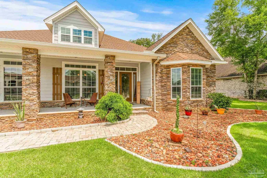 This stunning 5-bedroom, 3-bathroom single-level home offers 3088 sqft of luxurious living space and impressive curb appeal. Custom pavers and red river rocks enhance the driveway, walkway, and large backyard patio, creating an inviting entry. Burnt barnwood hardwood floors flow throughout much of the home. The open study with bay windows and dining room are perfect for hosting guests. A private alcove features two bedrooms with a full bathroom. At the end of the foyer, the spacious living room boasts double tray ceilings and a gas fireplace. The heart of the home is the kitchen, showcasing granite countertops, custom Sonoma-style cabinets, top-of-the-line Samsung smart appliances, and a whisper-quiet dishwasher for effortless cleanup. The breakfast bar and bright nook provide a perfect spot for casual meals and morning gatherings. The master suite is a peaceful sanctuary, with trey ceilings, crown molding, and private access to the Florida room. The luxurious master bath includes granite countertops, double vanities, a garden tub, custom-tiled walk-in shower, and an oversized closet with built-in dressers. Two large bedrooms and the third full bathroom are on the other side of the home. The enclosed Florida room offers serene views of the private backyard. Outdoors, enjoy a 16x26 pergola with retractable sunshade over a stone patio, ideal for gatherings. The air-conditioned shed and retractable garage door screen provide comfort for projects. This home is equipped with a power transfer switch, gas generator, and hurricane window covers for added peace of mind. Nestled in the sought-after, family-friendly Nature Trail community, this home is just steps away from an array of fantastic amenities, including a community clubhouse, sparkling pools, tennis and pickleball courts, a state-of-the-art fitness center, parks, nature trails, and more. Call today to experience the epitome of luxury living in this meticulously crafted home.
