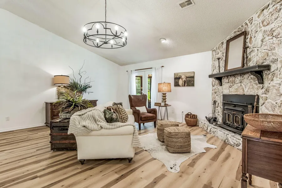 HUGE $20K+ Price Reduction! This truly is country living at it's finest! Zoned Rural Residential (RR) and situated on a lovely landscaped 2-acre lot, this spacious, split floor plan, 3-bedroom, 2-bathroom home seamlessly combines rustic charm in an organic farmhouse style, offering a perfect retreat for those seeking a peaceful lifestyle. Step inside to discover soaring Ceilings in the Great room, a freshly painted interior and new LVP flooring that flows throughout the whole home, along with Cypress and Cedar accents. The inviting sunroom is the perfect spot to relax and soak in the natural light, overlooking the flowers & trees in the pretty back yard; or curl up on the sofa in front of the newly whitewashed, river rock fireplace with it's wood burning stove,