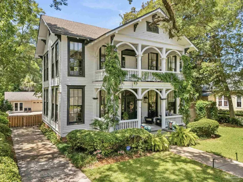 Rich heritage abounds in this extraordinary Victorian estate. Rebuilt on its current site, using elements from Pensacola's first schoolhouse, this grand two-story property is a testament to timeless design, classic craftsmanship, and meticulous stewardship. Spanning over 2,600 square feet on a generously sized 0.33-acre lot, the home features four spacious bedrooms, two refined bathrooms, and a layout that flows with both grace and purpose. Towering 11-foot ceilings and stately 9-foot windows allow natural light to pour into each room, illuminating the warmth of original heart pine flooring, intricate moldings, and 9-inch baseboards. Period charm abounds in every room-from the grand dining space to the expansive living area and intimate first-floor secretary's nook. The kitchen and bathrooms have been thoughtfully remodeled over the years, blending historic elegance with updated finishes and convenience. Modern upgrades include new electrical wiring, two recently replaced HVAC systems, a tankless water heater, and a brand-new roof installed Sept 2025-ensuring the comforts of today remain at the forefront. Outside, the magic continues. Twin porches-one on each floor-capture gentle breezes and offer front-row views of majestic heritage oaks. A 35'x 23' brick patio, winding garden paths, and charming brick walkways invite you to entertain or unwind in a lush, private setting. The beautifully-landscaped yard includes a detached, oversized two-car garage, a fully heated and cooled bonus studio ideal for an artist's retreat or office, and a powered garden shed perfect for additional storage for your passions and projects. Located in the heart of East Hill, you're just minutes from vibrant downtown Pensacola, schools, local eateries, medical centers, and military bases. Rarely does a property of such historic significance, architectural grace, and thoughtful modernization come to market. This is more than a home-it's a legacy waiting to be shared.