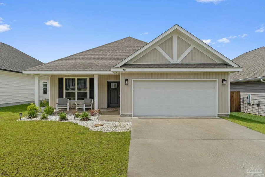 Welcome to 253 Camellia Dr in the desirable Mahogany Woods community! Built in 2023, this beautifully maintained 3-bedroom, 2.5-bath home with a bonus room offers modern comfort and thoughtful design in every corner. With 9-foot ceilings throughout, the home feels spacious and inviting from the moment you walk in. The heart of the home features a stunning open-concept layout with granite countertops, stainless steel appliances, and a large island perfect for gathering. The tray ceilings in both the living room and master bedroom add an elegant touch of architectural interest. The split-bedroom floor plan provides added privacy, with a spacious master suite that boasts a large walk-in closet, dual vanities, soaking garden tub, and separate shower. The bonus room adds versatility—perfect for a home office, playroom, or guest space. Step outside to a covered back porch overlooking the fully...