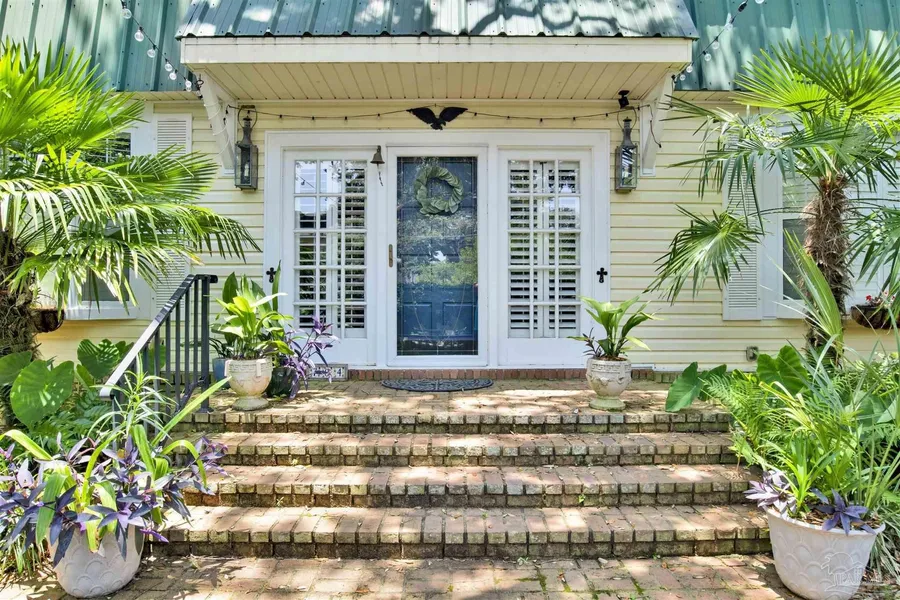 Welcome to this charming Bayshore bungalow, where timeless character meets modern comfort. Behind a private brick courtyard shaded by majestic oaks, you’ll find an inviting outdoor retreat perfect for entertaining or quiet evenings. Inside, a warm brick foyer opens to gleaming Brazilian hardwood floors and spacious living areas, including one with a cozy gas log fireplace. The office features built-in bookshelves, adding both functionality and a sophisticated touch, while modern wallpaper accents bring pops of personality throughout the home. The chef’s kitchen stands out with a Viking range, refrigerator, warming drawer, Bosch dishwasher, custom cabinetry, and a built-in espresso/coffee machine. A formal dining room just off the kitchen is perfect for hosting family and friends. The rear bedroom has been fully renovated with an updated bathroom and French doors leading to a private patio, an ideal spot for morning coffee or catching glimpses of the Blue Angels in practice. Additional features include impact windows, a one-car garage, carport, and detached storage building. Living on Bayshore Drive offers a unique blend of charm and convenience. Take daily walks along Bayshore, where water views provide a peaceful start or finish to your day. Hop on a golf cart and ride less than a mile to the Pensacola Country Club, or take advantage of nearby marinas and the Pensacola Yacht Club, only 1.5 miles away. This home can be sold furnished, making it truly move-in ready. With its flexible layout (including a private 1 bed / 1 bath suite) it also offers rare potential for two Airbnb rentals in one property. Located close to downtown, NAS Pensacola, hospitals, and just a short drive to Pensacola Beach (11 miles) and Perdido Key (14 miles), this home delivers the perfect balance of convenience and Gulf Coast lifestyle.