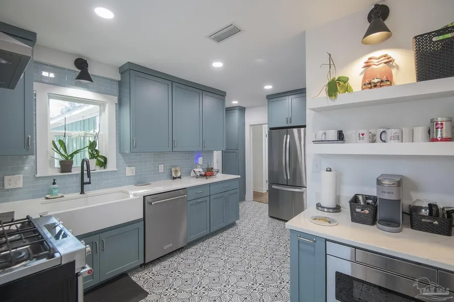East Hill Home with Extensive Remodel 2023 - across from park corner lot at 19th Ave. & Yonge St. 3 Bedrooms and 2 Full Baths, 1,557 square feet. New Roof, One Car garage, ALL NEW HIGH END CUSTOM KITCHEN (gutted &rebuilt by custom builder) as well as new lovely bright MASTER BATHROOM, ALL NEW Electrical, NEW Plumbing in accessible areas, NEW WINDOWS, Cast iron pipes replaced in crawl space. ALL NEW HARDIE PLANK EXTERIOR SIDING. The light and white tones in new Kitchen with upscale tile, stainless appliances, gas stove, soft close new cabinets, pull out shelves in pantry, built in spice rack, white quartz countertops, coffer bar, new fixtures, tile backsplash, and farm sink. New stack washer/dryer. NEW GEOTHERMAL Heating/Cooling AC system, NEW tankless hot water, empire zoysa grass and landscaping, new paved patio front and back, treatment system for pest control install. Encapsulated crawl space with remaining 2 years for annual dehumidification and service inspections. This home is charming, complete with separate dining/living area and enclosed Florida room facing well managed Zamora Park! The proximity of this home to grand Bayview park is walking distance, to historic 12th Avenue corridor, shops, breweries, restaurants, and Bayou Texar make this home truly central to East Hill neighborhood. Hurricane protection for windows and doors. Exterior siding also has new added wall insulation. Owner added over $280,000 in renovations. This home is move in ready and high quality craftmanship, well thought out and great floor plan. Master suite is private from other 2 rooms that share a full bathroom. Enclosed Florida Room faces the park, great for plants and morning sun. The front paved patio has built in firepit and lovely landscape. The home is ready to move into and one that you would be proud to call home. Directly across from Zamora Park w/ paths, basketball& playsets! This home is classic East Hill!