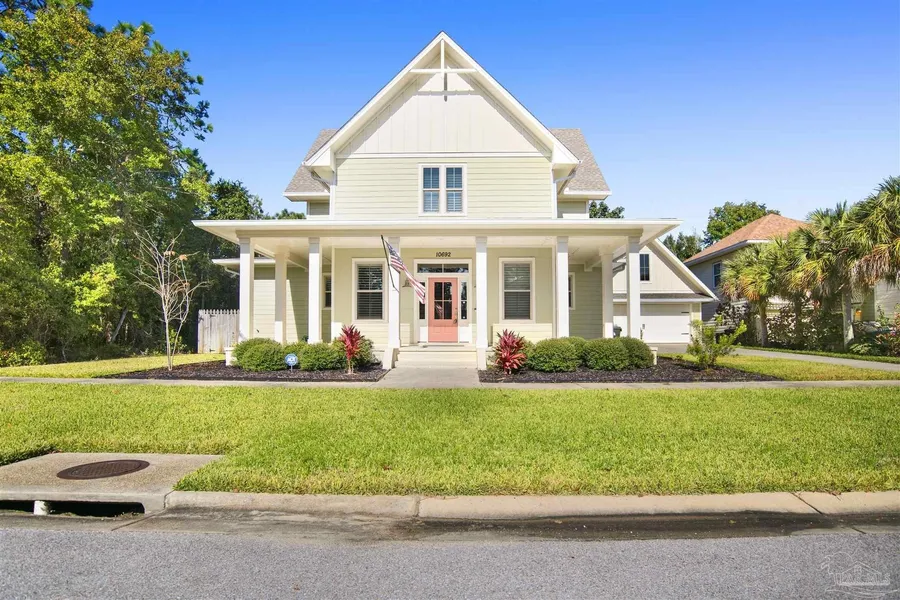 Welcome to this beautiful custom home in the desirable Leeward subdivision perfectly situated just minutes from NAS Pensacola's back gate and the stunning white sands of Perdido Key. This spacious 4-bedroom, 3.5-bath home offers comfort, convenience, and style in the Leeward subdivision. The open-concept floor plan features hardwood, tile, and plush carpet flooring throughout, along with granite countertops, stainless steel appliances, and a large kitchen island overlooking the living and dining areas. Enjoy cozy evenings by the gas fireplace, or unwind in the serene primary suite with vaulted ceilings, dual vanities, and a walk-in shower. The half bath on the main level is ideally located for guests and easy access from the common areas. Outside, you'll love the fully fenced backyard, oversized detached two-car garage, and beautifully maintained landscaping. The Leeward community prov...