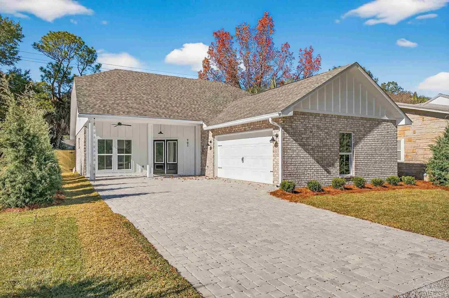 This newly built home is conveniently situated just minutes from local shopping and dining options, including a grocery store, bakery, bistro, and more. It offers a charming coastal vibe and is only a short drive to downtown Pensacola and Pensacola Beach. The inviting paver driveway leads up to the house and the side-entry two-car garage. Under the covered front porch, you'll find the main entrance, which welcomes you with plenty of natural light and high ceilings. The open concept living room and kitchen are on the main floor, along with the primary suite, a full guest bathroom with a tile wall shower, a guest bedroom, and a laundry room. The kitchen features modern white cabinets, quartz countertops, a stainless steel gas range, refrigerator, dishwasher, and a full pantry with built-in shelves. Both the kitchen and living room have wood-look tile plank flooring. The primary suite offers a spacious bedroom with a tray ceiling and soft ambient lighting, tile flooring, and peaceful views of the lush backyard trees. The primary bathroom includes a double vanity with quartz countertops, a relaxing free-standing tub, and a beautiful tile shower with a frameless glass door. It also provides two closets for plenty of storage. Upstairs, there's a full bathroom with a tile wall shower, two additional bedrooms, and a versatile bonus room with a linen closet. The South-facing upstairs bedroom has a partial water view of the Bay. The roof and exterior walls feature upgraded insulation. Out back, you'll find a privacy fence, an open patio, and vibrant landscaping that offers both sound dampening and privacy. Additional features include impact-resistant windows and front door, a tankless gas water heater, and yard sprinkler system. Schedule a showing to see this home today!
