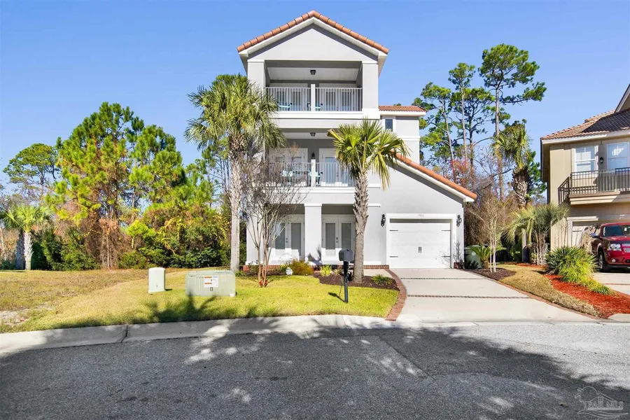 Welcome to 7955 Double Gate Drive, ideally situated in the fabulous Arborgate community at Perdido Key. This exceptional property offers versatility as a primary residence or a second home for memorable family getaways and has been used exclusively as a vacation home, never rented. The 4 bedroom / 3.5 bath Spanish-style residence features a well-appointed kitchen with granite countertops, stainless steel appliances, and tile flooring throughout the main level. Additional upgrades include an epoxy-coated garage floor, Wi-Fi controlled thermostats, and a security alarm system with cameras for added convenience and peace of mind. The spacious primary suite, located on the second floor, offers an en-suite bath and a covered balcony—ideal for relaxing and enjoying the coastal atmosphere. The third level includes two additional bedrooms, each with a private bath, along with another covered balcony for additional outdoor living space. Outdoor features include a newly sodded yard with Wi-Fi controlled Rain-Bird irrigation system and a charming back deck complete with an outdoor shower, perfect after a day at the beach. Residents of Arborgate enjoy access to a community pool and is just a short distance to bike trails and public beach access, making this home an outstanding opportunity to experience the best of Perdido Key living.