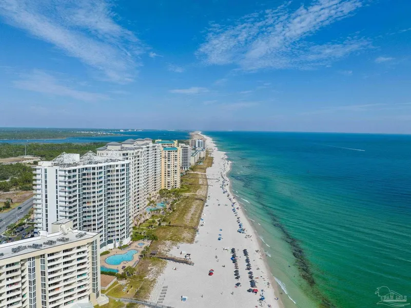Wake up to the sound of waves and panoramic Gulf views from this beautifully furnished 2-bedroom, 2-bath condo at Palacio in Perdido Key. Ideally positioned on the 5th floor, this Gulf-front unit provides a spacious 1,310 square feet and a large beachfront balcony that directly faces the shoreline, offering front-row seats to spectacular sunsets! The open-concept layout includes a modern kitchen and a light-filled living area designed for both relaxation and entertaining. The primary suite is a peaceful retreat with a walk-in closet, dual vanities, an enclosed water closet, a garden tub, and a separate glass-enclosed shower. Ceramic tile flows throughout the living areas and the bedrooms have updated luxury vinyl, creating a clean, coastal look that’s perfect for beach life and easy to maintain. An in-unit washer and dryer make it convenient to toss in your towels and swim trunks after a...