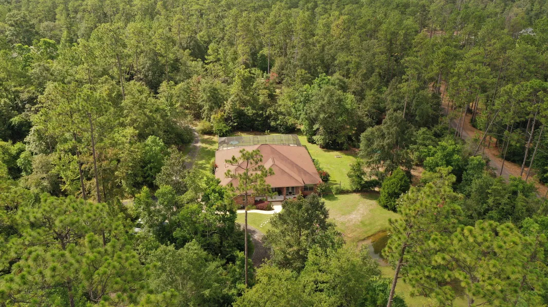 Molino, FL - NEW PRICE! Pilgrim Trail - Experience peaceful living at this quiet, southern estate. This 9.8-acre private wooded property is the perfect place to escape it all. Take in the scenery from the 500' shaded driveway made from recycled asphalt which leads you to this gorgeous 3136 sqft custom-built home with 4 beds, 3 baths. The open floor plan welcomes the outside in. Seamless indoor-outdoor living is possible with 2 sets of double French doors opening to the front porch; and four banks of triple French doors across the back of the home that open to an 1800 sqft lanai enclosing your in-ground swimming pool with a relaxing rock waterfall. The interior was designed to create comfortable yet elegant spaces that show off all its amenities: an electric fireplace in the living room, quality finishes, tranquil views, an abundance of natural light - just to name a few! The pristine gourmet kitchen is complete with an island, granite countertops, stainless steel appliances, a gas cooktop, wall oven, and a large walk-in pantry. The Florida room provides additional living/entertaining space with pool access. Enjoy relaxing evenings in the spacious master suite, complete with tray ceilings and 2 walk-in closets. The master bath focuses on relaxation with a 40-gallon jetted tub and a separate shower. Work from home in the large office or use as an extra space for guests that offers exterior access. An 800 sqft, 2-story, insulated cabin/cottage is partially completed but would be perfect to use as a guesthouse or personal retreat! The well-kept property grounds also include a storage building and an impressive workshop perfect for hobbies or storing yard equipment. Privacy and security consist of deer fencing adjoining the home, a closed circuit surveillance system, and an oversized two-car garage. Relaxation is inevitable in this peaceful, wooded setting where your only worry may be deciding where to hang the family photo. Call now for your private tour!