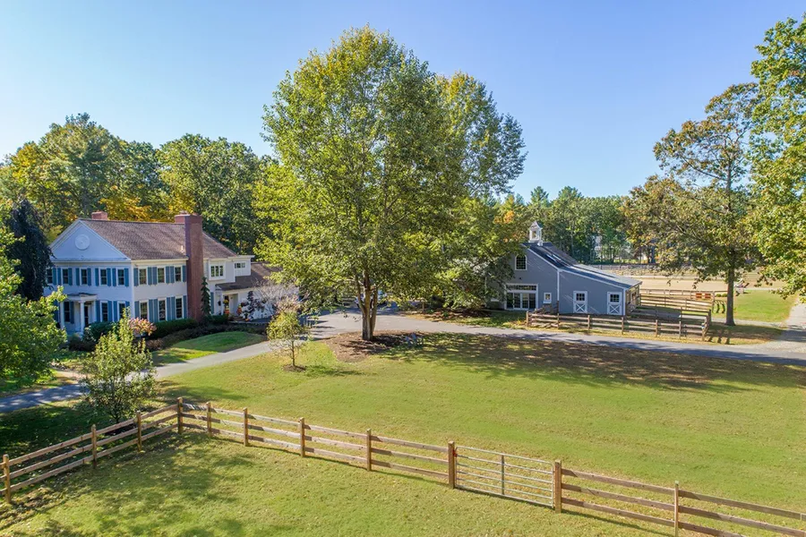 Hoof-N-Woof Farm is privately situated on 6.93+/- acres in Boxford, only 35 minutes north of Boston and near Route 95. This picturesque farm includes a beautifully updated 4-bedroom Colonial, a reproduction of the Noah Webster house, and meticulously designed equine amenities. The move-in ready farm is extremely well laid out providing a wonderful balance between family life and horse life. Highlights of the residence include a new chefs kitchen with 5-burner gas stove, four working fireplaces, primary bedroom suite with en-suite bath, walk-in closet and additional laundry, library, three-season porch and attached three-car garage. State-of-the- art facilities include a workshop with 2nd floor office and hayloft, two attached barns with a total of 7 stalls, and 5 paddocks. There is an additional 6.6+/- acre lot for sale with 3 additional paddocks, a 100X180 riding ring, and building potential.