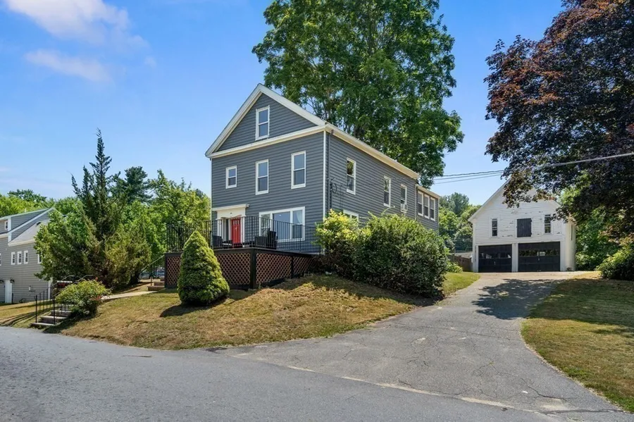This spacious Colonial is tucked away on a quiet side street but still just minutes from shopping, Commuter Rail & Merrimac River. Sited on corner lot the exterior offers a large yard, front deck perfect for entertaining and relaxing, fully fenced backyard with patio, plenty of offstreet parking plus a two story barn with electricity. Enter the front door into the foyer and find coat closet, hardwood flooring which leads to large open concept LR/DR with recessed lighting, picture window and first floor full bath complete with steam shower. Kitchen offers a layout ideal for cooking, abundance of cabinets & counter space also a dining area and access to the yard. Second floor includes two generously sized bedrooms both with carpet & closets, full bath and large Main Bed with en suite full bath. Pull down attic access, second floor laundry (W/D left as gifts) and full basement. SHOWINGS BEGIN ON SATURDAY 7/16 & SUNDAY 7/17, 12:00-1:30. OFFER REVIEW TUESDAY JULY 19 @ 6:00