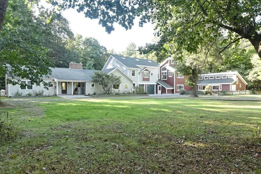 This is a great home for an in-house business or hobby enthusiast with a potential in-law apartment. The 2nd floor primary suite and extra bedroom each feature fabulous loft spaces and high ceilings. Main floor has large eat-in kitchen w/bamboo cabinets, a contemporary open floor plan with family and dining rooms that lead to outdoor decks and fenced yards. A large, well lit and high ceilinged bonus space upstairs with great potential for family activities: game room, crafts studio, business offices. Oversized 2 car garage w/built-in storage and workspaces. 2 huge ground floor spaces could be converted for more garages/boat storage. Mini-splits. Two 200A circuit breaker system. Tree fort in the generous back yard w/garden shed. Pole barn w/lots of space to accommodate the established raised garden beds w/built-in watering system. A great entertaining house. Located on a quiet side street a mile from interstate. Great Boxford school system