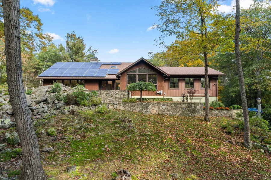 Private home on a 4.13 acres exclusive lot on a cul-de-sac, abutting conservation land. The main floor offers a primary bedroom, living room with fireplace, dining room, kitchen, half bathroom, study, washer/dryer room and a beautiful new addition. The primary en-suite includes, walk-in closet, custom bath and tiled shower with all the modern amenities. On the lower level, you will find three other bedrooms, full bath, and an office. This home has a four door garage. Two attached garages to the home and two garages detached with a second floor bonus room with plenty of closet space. This home is one of a kind and is situated on a hilltop and offers inspiring Japanese-style Zen gardens with waterfall and Koi Pond that has timelessly chic interiors greeting you at every turn. Conveniently, located in East Boxford and minutes from the highway, shopping and easy access to Boston.