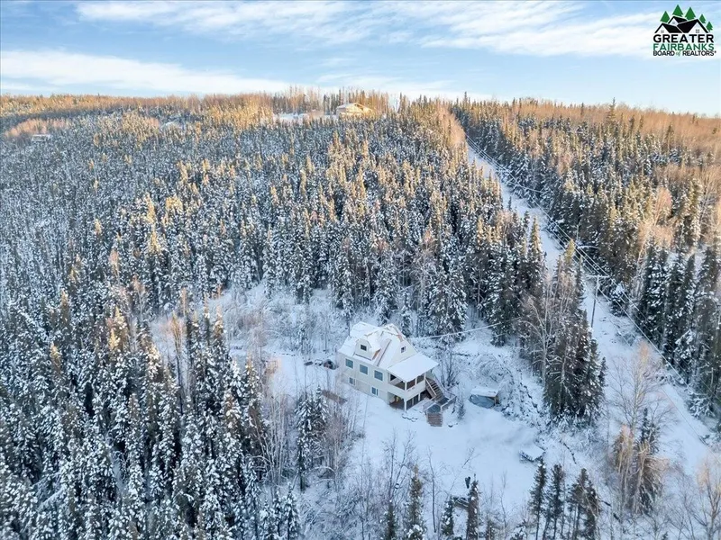 Nestled on 5 peaceful acres in the hills of Fairbanks, this charming 3-bedroom, 2-bath home offers true Alaskan comfort surrounded by wooded privacy. Large windows brighten the main living area and frame serene forest views, while warm wood accents and a smart, efficient layout create a cozy yet open feel. The kitchen provides generous cabinet space, clean appliances, and a dining nook overlooking the trees. The upper level features a versatile bonus space with beautiful natural light - perfect for a primary suite, home office, additional bedroom, or creative studio. Both bathrooms are well-appointed, and each bedroom offers comfortable separation and views of the surrounding landscape. Outside, a covered front porch and spacious deck invite year-round enjoyment, whether you’re taking in the midnight sun or watching a quiet winter snowfall. The gently wooded acreage provides usable yard space, ample parking, and plenty of room to expand, garden, or build additional structures. If you’re seeking a home with character, privacy, and that classic Alaskan setting, this property is a standout opportunity. Schedule your private showing today!
