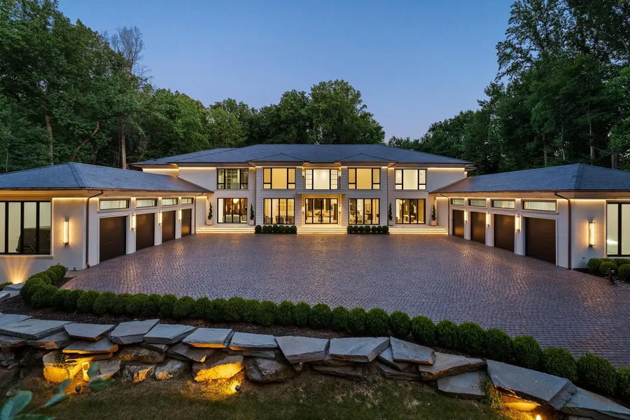 A long, private drive introduces the gated entrance, promising seclusion and exclusivity. Beyond the gates, a gently winding path of European cobblestones leads to a grand parking court, flanked by double height, eight-car, climate controlled garages, setting the stage for the architectural masterpiece that awaits.