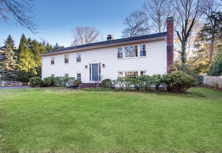 This wonderful 4/5 bedroom home enjoys a first rate ''in-town'' location, just a short stroll to schools, parks, town and train. The main floor welcomes you into a spacious living room with fireplace and vaulted ceiling, a light and open feel. The inviting kitchen is surrounded by the living room, dining room and leads to a cheerful sunporch overlooking the private backyard. The Master bedroom and 2 other bedrooms complete the main floor. One bedroom has adjacent sitting room /office that may serve as a 5th bedroom. On the lower level, a bright and sunny family room, 4th bedroom and bath and the perfect home office! Tremendous interior space offering flexibility and privacy for all. Attached 2-car garage and level backyard. Excellent value, convenient to all that New Canaan has to offer!