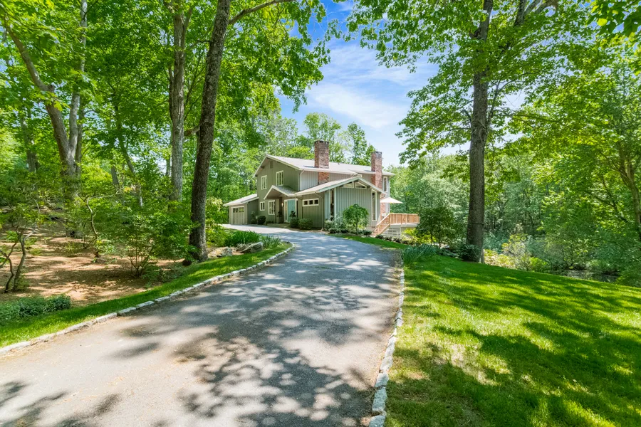 This Light, Bright Contemporary with open floor plan, nature and pond views is located on a quiet lane in a convenient location to both Wilton and New Canaan shopping and dining attractions. You will love the soaring ceilings, 3 floors of living space featuring 3 fireplaces, 3 decks and an outdoor fire pit area all for enjoying the serene views. An inspirational vibe throughout is reflected in the BRAND NEW MASTER BATH with designer glass shower stall and quartz countertops. The home also has a new Miele dishwasher, lower level wall to wall carpeting, and exterior painting, all completed since 2020. Other updates include roof, hall bath, shared roadway replacement, garage door, enhanced landscaping, updated lighting, well pump, spray foam insulation, hardware, gutters, walkways and fire pit. Ready for your personal touches and enjoyment!