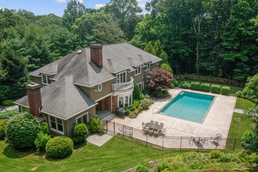 Right across from the Saugatuck Reservoir, enter through stone pillars to the first house over the Weston line. This sanctuary setting abuts 9 acres of the Redding Land Trust, a total of 2000 acres of hiking trails, open space, peaceful woodlands, splashing streams and sweeping vistas across open meadows. Totally re-built in 2002, this 5-bedroom, 5000+ sq. ft. home has a perfect layout for modern living. The Primary suite with its own staircase has 2 bathrooms, a large dressing room and a balcony with French doors overlooking the pool (new in 2015) and miles of scenic protected space. Four additional spacious bedrooms, 2 large bathrooms, laundry room and walk-up attic complete the 2nd floor. The main level has a large, living room with beautiful year-round views of the back yard and into the land trust. Two private offices (or den/library) are to one side of the living room and you can a...