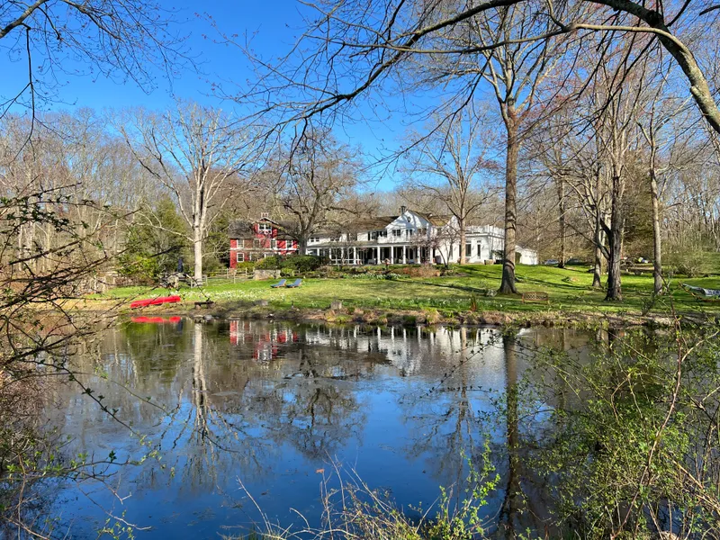 On a private lane abutting a 52-acre estate, this sylvan property offers complete privacy and is a nature lovers dream. This classic colonial with a vintage feel and flexible floor plan can support a modern lifestyle in a myriad ways. The sun drenched formal living and dining rooms are elegantly appointed, The expansive eat-in kitchen with fireplace and adjacent office/den both have French doors which open up to a screened-in and covered porch overlooking the pond, gardens and walking trails. Formerly home to two artists, the barn connected to the main house with interior access serves as a secondary family room with ample space for other activities. The second skylit studio was redesigned by noted architect Neil Hauck to be a first floor primary bedroom with a stunning marble bath or alternatively could be a state-of-the art fitness center, The original primary bedroom on the upper floo...