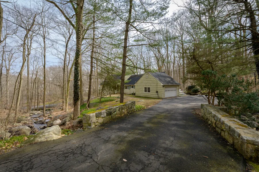 The setting unique! Corner lot with picturesque views and the soothing sounds of a cascading waterfall surrounded by nature for complete privacy in convenient lower North Stamford. True one floor living is possible in this oversized cape. Two story entry foyer, hardwood floors and well laid out spaces with generous rooms throughout. Garages are on grade with a ramp over one step into the mudroom. Main floor master bedroom plus two additional main floor bedrooms. Two oversized second floor bedrooms share a full bath. Ample walk in attic spaces and full, unfinished walkout basement. A much loved and well maintained home that will require your updates and improvements. Generac generator 2011, Peerless boiler and oil tanks 2018, well holding tank 2016, well pump 2019.