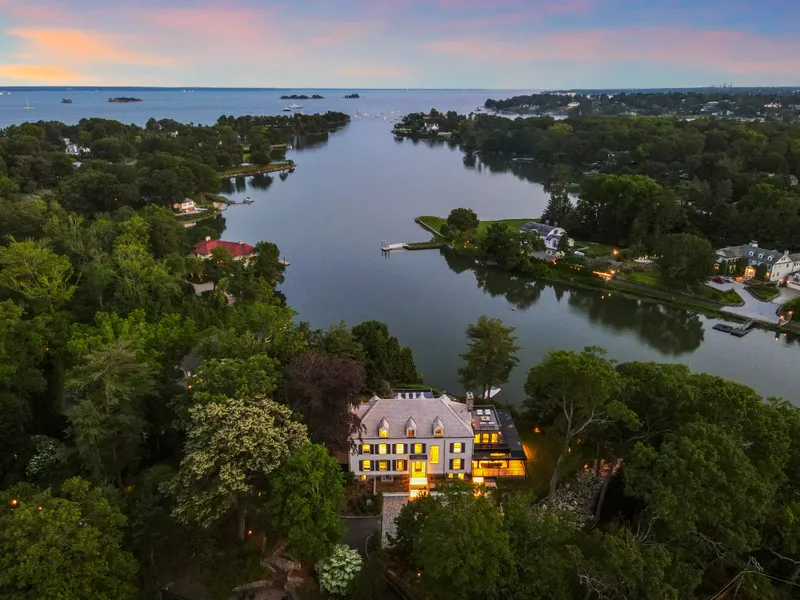 Capturing magnificent light and striking water vistas, this resort-like aerie sits high above Indian Harbor on 292' of private water frontage with a waterside entertaining deck, boathouse and floating dock. A down to the studs gut renovation of the original historic home while adding a stylish contemporary aesthetic. The sublime interiors embrace the coastal setting from nearly every room. Floor to ceiling walls of glass and enchanting outdoor spaces designed for entertaining take in the expansive views of the Long Island Sound. Idyllic owner's suite with luxurious bathroom and waterfront balcony. Lower level with dine-in wine cellar, future theater space and wellness center. Tennis court, two bedroom cottage and pool complete this sybaritic paradise ready for summer occupancy.