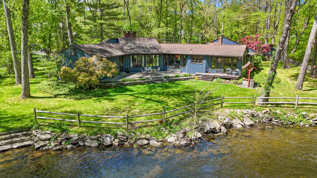Captivating riverfront ranch! Unparalleled one-level living thoughtfully designed to exude a sense of openness and connection to the outdoors at every turn. Idyllic one acre setting surrounded by mature trees, enchanting perennial plantings, and the gentle whisper of the Saugatuck River creating the ideal backdrop for effortless relaxation. Step inside to discover rooms illuminated by skylights and enveloped in walls of glass, bathing the interiors in sunlight and offering tranquil river vistas, inviting you to unwind. Experience the sense of calm of the open and airy living room, showcasing gleaming hardwood floors and a peaceful wood-burning fireplace set against a striking brick accent wall or the intimate embrace of the sunroom encased in glass offering a cozy place to gather. Delight in the sublime renovated kitchen with gorgeous cherry wood lower cabinets featured in soothing Husk Suede, upper cabinets in crisp dove white, sleek quartz counters & custom designed artisan tile backsplash in hues inspired by the river. Infused with modern elegance, this space boasts Café line stainless steel appliances equipped with smart technology, a dynamite breakfast bar with seating for two, and an open concept dining room with sliders connecting to the expansive terrace for seamless indoor/outdoor entertaining. Discover an optimal layout where the primary bedroom is secluded on one side while guest bedrooms occupy the opposite wing, achieving a harmonious blend of privacy and functionality. The entire wing is dedicated to a stunning primary suite, boasting soaring ceilings, a walk-in closet, built-in bookshelves, sliders to a private patio, and a spa-like well-appointed private bath featuring a luxurious soaking tub, separate shower, and double vanities. Enjoy a private entrance with a sizable mudroom and an adjacent bonus room adaptable for an office, nursery, or workout space. On the opposite side, you will find two generous sun-filled guest bedrooms with ample closets, one offering a huge bay window and skylight, and the other with double sun exposure with floor to ceiling windows overlooking the river plus another window facing the front, together offering the natural gentle breeze of cross ventilation. For added comfort, the guest wing also features a well-appointed full bath, complete with a charming pedestal sink and a subway-tiled tub/shower combo. Enjoy the convenience of a two-car garage, complete with a spacious attic and a generous outdoor shed, for your additional storage needs. Located in coveted lower Weston, Slumber Corners offers the advantage of a private street absent of thru-traffic, and a tranquil environment that is minutes from everything but feels worlds apart.