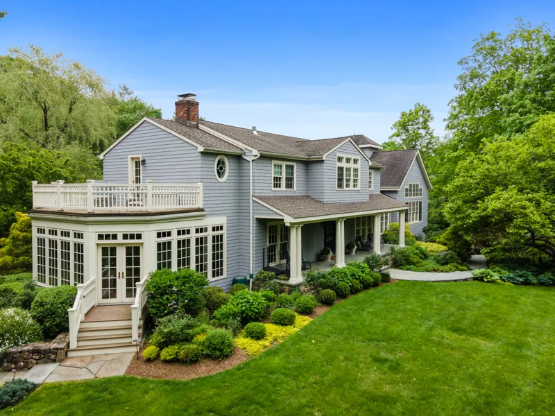 Superior craftsmanship, sublime setting! For the discerning buyer, this spectacular home was completely rebuilt and expanded in 2005, using only the finest quality materials. As you pass through the stone pillars you can see that this stunning home sits between gorgeous gardens and an expansive lawn. The home boasts a rocking chair porch leading to a gracious foyer, continuing to the bright gourmet kitchen with Viking appliances, gas fireplace, mahogany cabinets and dining area with built in seating. There is an elegant dining room, romantic living room with fireplace and built in bookcases, and a family room with fireplace. The home's crown jewels are the sunroom with floor to ceiling windows with heated travertine floor, and the 25' by 35' post and beam great room, with wide plank flooring, and soaring walls of glass, perfect for entertaining or just relaxing. Upstairs the primary bedroom boasts a tray ceiling, Solas linear gas fireplace, his and hers walk in closets, marble bath and private terrace, perfect for coffee or a cocktail. In addition, there are three more well sized bedrooms. The lower level adds almost another 1000 sq ft of walk out finished space, with a full bath, dry bar, gym and potting room. Lastly, a heated three car garage, a landscaping garage, another mahogany deck, bluestone patio /walkways and custom exterior lighting. Stunning perennial gardens that are filled with an abundance of hand chosen plantings were created by a renowned NYC florist.
