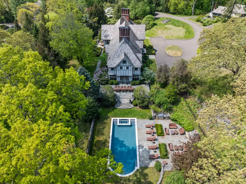 The distinguished 19-room manor, with its striking half-timbered granite façade and slate roof, features an array of imported and antique appointments. Intricately carved moldings, friezes, water-gilded cabinetry, and Sherle Wagner fixtures add an elevated touch throughout the residence. Skilled artisans meticulously refurbished antique parquet, marble, and limestone flooring, rich paneling, and ornately ...