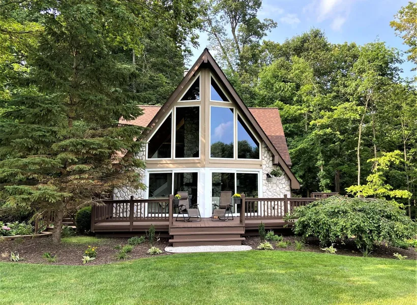 A-frame home on 7.48 acres w/3 car garage, 4 stall horse barn w/fenced in pasture, fenced in garden w/raised beds, 15x30 home gym or office, wooded acreage w/trails, completely remodeled and finished walk out basement and upstairs. Great commute location and private setting in the back of a shared gravel drive.