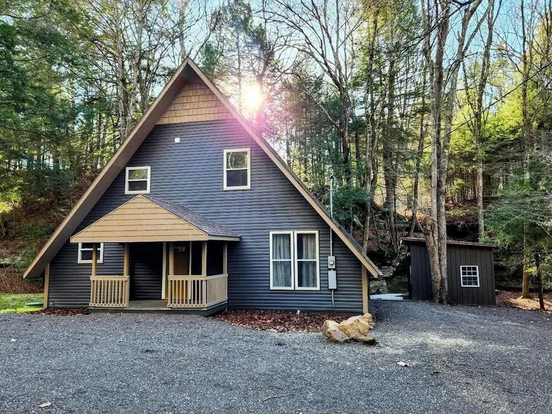 Discover RockFall Retreat, a breathtaking A-frame cabin nestled among striking rock formations with a seasonal waterfall and creek just steps from the back door. This fully furnished, turn-key property is a rare opportunity to own a nature-rich getaway as a short-term rental. The sale includes all furnishings and existing bookings, making it a turnkey investment. Boasting 4 spacious bedrooms and 2 full baths, the home comfortably sleeps up to 12 guests. Inside, you'll find a warm and inviting open-concept living space with soaring cathedral ceilings, a fully equipped kitchen with seating for 12, and direct access to the outdoor patio. The layout includes two king bedrooms on the main level-one with private patio doors-a cozy upstairs queen room, and a large bunk-style room featuring three queen beds, a TV, and a mini basketball hoop. Outside, enjoy a private hot tub overlooking the stunn...