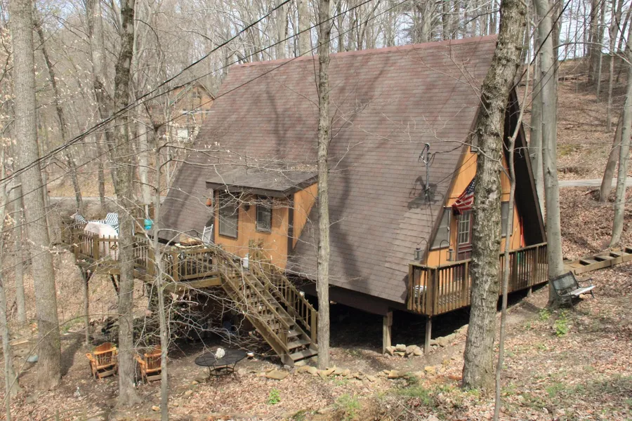 (SOLD - June 2017) Discover this great escape home & resort community near southeast Ohio's famous Hocking Hills Region. Located close to main security gate, docks & playground, this getaway with 2 heavily wooded lots is offered w/some furnishings plus appliances including washer & dryer. News include flooring, fixtures, kitchen, electric, landscaping, paint, dishwasher. Other improvements, additions & updates in recent years include an 11x11 storage room, side deck & steps, re-staining and paint plus powerwash, ceiling fans, structural & efficiency improvements, more. WOW wall of windows opening to the expansive decks across the side and rear that overlook nature across the ravine, + spacious loft bedroom. You'll also appreciate central HVAC system, newer appliances, mechanicals, more! Hide-A-Way Hills Club members enjoy boating & fishing lakes,golf & tennis,lodge-restaurant & microbrewery,pool & beach,ATV trails & stables,24/7 security!