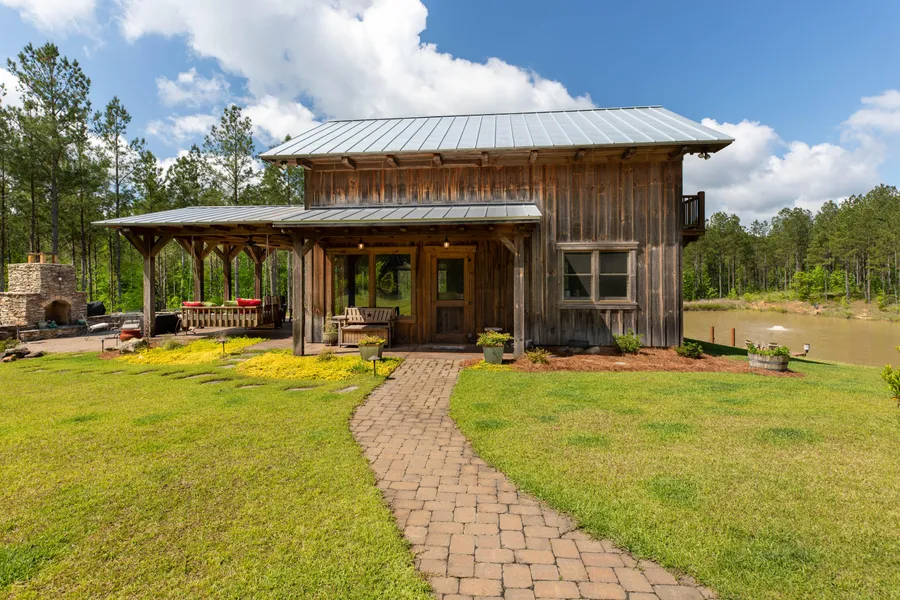 The custom well-built cabin features a beautiful barn-wood look inside and out, 20 foot ceilings with mortise and tenon construction. The main level features the great room with fireplace, dining area, kitchen with breakfast bar, pantry, laundry and full bath. The bedroom and sitting area are located in the loft. Walk out onto the balcony that overlooks the large pond and beautiful views of the back of the property. Spend the afternoon relaxing under the covered porch with a full size bed swing, television and sun shade. Enjoy the evening time by building a cozy fire in the outdoor fireplace and sitting around enjoying the tranquility of nature on the stone patio.