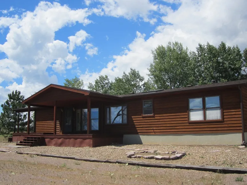 Cedar sided custom built manufactured home on 74.9 acres. Only 4 miles to Angostura Recreation area. Open floor plan. Large kitchen with morning room, snack bar and built in desk. Living and dining room combined. Bay window and front covered deck. Master bedroom has double closets, soaking tub, double sinks and walk-in double shower. Patio door to deck. The 2nd bedroom has a patio door to the back open deck. Exterior side door entry into mud/utility room. Oversized detached garage built in 2008 with concrete floor, garage openers and 220. Rural water services the property. Property is fenced. Property has 2 legal descriptions with the home and 9.92 acres and the remaining 64.98 acres.