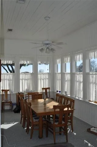 Inside there are 5 bedrooms and 2-1/2 baths. Master suite and two other bedrooms are downstairs. Two bedrooms or bedroom and office/hobby room are upstairs. Downstairs the kitchen, den and dining are a wonderful open area. Rooms are full of natural light, lots of windows. There are eleven Hunter ceiling fans with lights. Downstair...