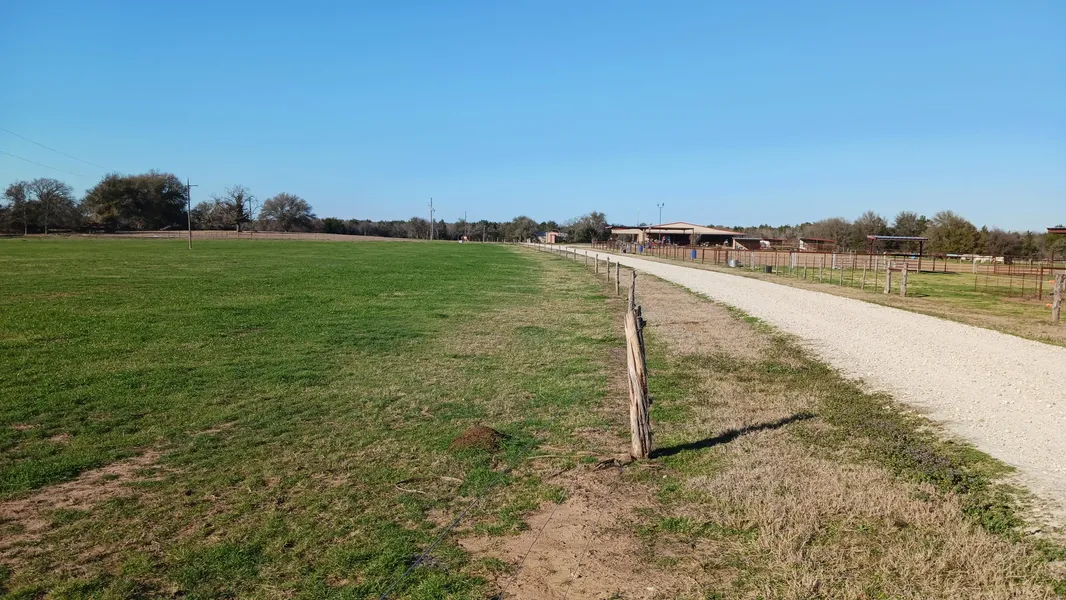 The property is entered by an iron gate and a long caliche drive past the outdoor arena. It has its own well and water is accessible throughout. The land is fenced and cross fenced into multiple pastures and paddocks with barbwire and electric fencing. There are 2 stocked ponds as well. One of the ponds has a concrete slab near the bank of the pond for your future outdoor space.