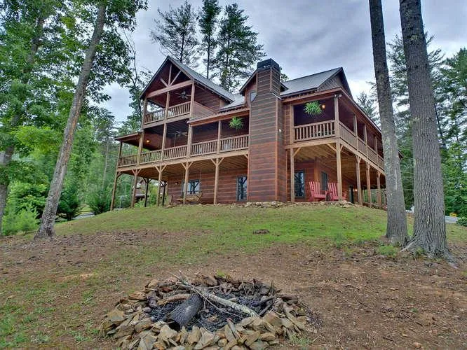3BR/3BA log sided home. This fully furnished home features hardwood floors, granite countertops, tile, finished terrace level with wet bar idea for a man cave or in-law apartment, two car carport, concrete drieway, and 3 fireplaces--2 inside with gas logs and one wood burning outside, over 2,000 sq ft of covered porches. Each bedroom has a private restroom and walk in closet.