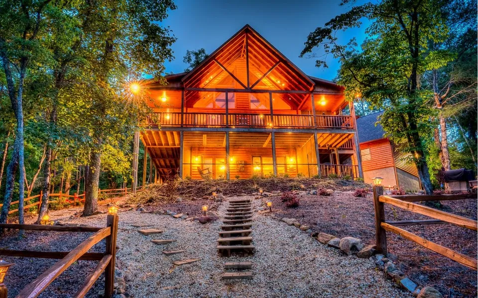 ATTENTION AGENTS: HIGHEST AND BEST BY 9 PM 12/11/2021. Includes hard to find huge double garage with storage. Pond front home for fishing and boating or add a private dock. Lovely setting in gated log cabin community. Stunning 3/3 waterfront with year round mountain views! Open concept perfect for entertaining. Party porch w/FP & tv hookup. Wrap around covered porches! Impeccable landscaping and outdoor entertainment areas. Expansive owner s retreat with a private screened porch. Spotless modern rustic cabin features: rustic custom cabinets, granite counters, pantry, hardwoods, mountain laurel railings, hand carved mantles, tiled walk-in showers, upgraded lighting, rich wood finishes in every room, outdoor screening to expand living areas, tankless hot water heater, water filtration, circular drive, and full finished basement! Close to dining and shopping. Neighborhood park and picnic area. *Short Term Rentals ARE Allowed*