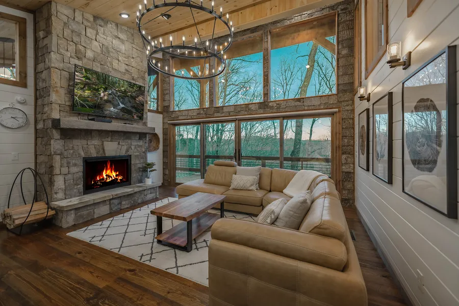 Welcome to Walking Bear Lodge! A modern rustic blend, this chalet overlooks views of the tree canopy down to Fightingtown Creek. With walls of glass in the main living room and open concept kitchen and dining, the first floor is perfect for entertaining with a door leading out to a large party porch with fireplace. Inside, cuddle up in front of the stacked stone fireplace. With two suites upstairs and an additional bunk space and bathroom on the terrace level as well as a large bar area den space. This home is perfect for either a short term rental or full time home! Terrace level deck has a fireplace, hot tub, and room for games. Complete with large carport, deeded creek access and pavilion, and less than five miles to Downtown McCaysville, this home will not last long! Call today.