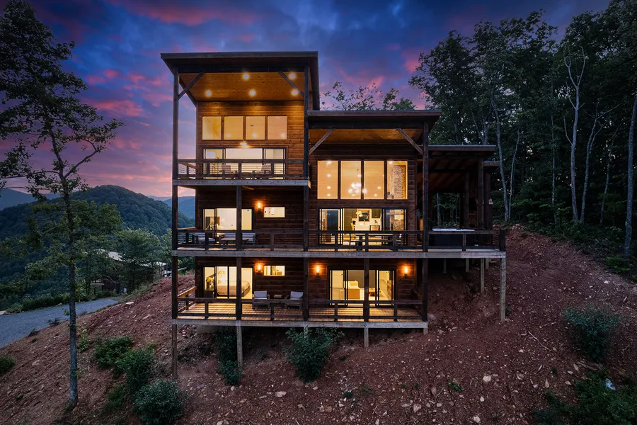 Modern Mountain Living : Welcome to Big Sky Lodge! With some of the best views in the area, this stunning contemporary rustic chalet perches above over ten ranges of layered mountain views in a highly sought-after gated community in the heart of Cashes Valley. The home is complete with three levels of indoor and outdoor living. On the main, find a large gourmet kitchen, wall of glass and sliding glass doors, towering stone fireplace, large living opening up to a gorgeous wraparound deck, party porch with fireplace, and hot tub, and stunning sunset views. Upstairs is complete with gaming loft, bedroom suite, and large balcony. Terrace level is finished with large den, fireplace, and additional sleeping suites. Sold fully turn key and with the potential of being a stunning full-time, second home, or one of the top rental destinations in the mountains, it's sure to leave you speechless.