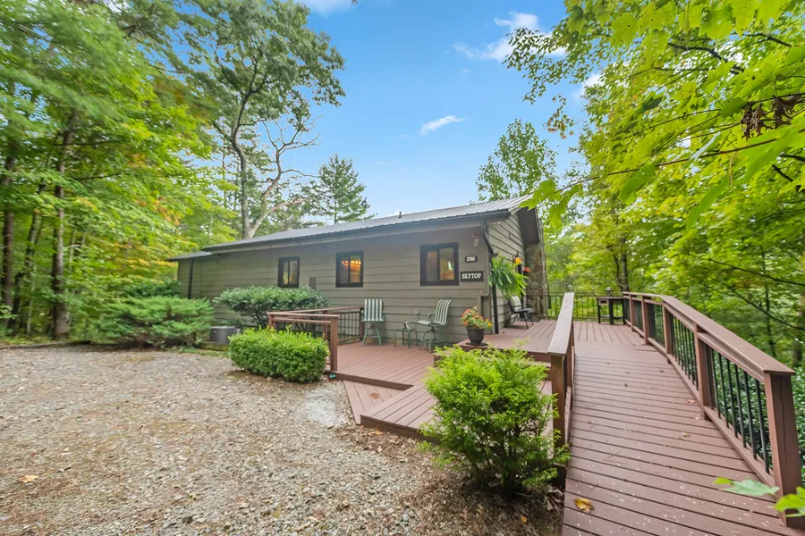 Nestled in the mountains just minutes from downtown Blue Ridge and Blue Ridge Marina, "Skytop" offers the perfect combination of privacy, comfort, and one of the best views in North Georgia. You'll be welcomed onto the property with a spacious driveway and a firepit. The breathtaking views from this home are best taken in from any one of the large deck areas facing out to the Blue Ridge Mountains. Inside, you will experience a true mountain cabin interior, with gorgeous hardwoods throughout the home. The floorplan is impeccably designed so that you're never more than a few steps away from one of the best views in Fannin County. Inside, you'll be greeted by the kitchen, which opens up into the upstairs dining area and the warm and welcoming living room below. The living area offers plenty of space for entertainment and access to a lower deck, but can also double as a great space to sleep ...