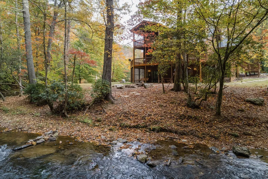 Welcome to The Wandering Wilscot Lodge... where you are surrounded by 500 acres of United States Forest Service ( USFS) and 678 feet of rushing Wilscot creek frontage with no restrictions! A place truly like no other... the grounds are gentle so you can step into the creek at any point on the property, wade across the creek and hike the USFS to Lake Blue Ridge, sit on your deck and take in the fall foliage and the waterfall across the water, and host all of your family and friends on the perfect lawn that runs along the creek bank. Being surrounded by National Forest, you won't have any neighbors and you're still just ten minutes from Downtown Blue Ridge on all-paved roads! Inside on the main floor is the an open-concept kitchen/dining, living area with a wood burning fireplace, the primary suite, and 100 year old reclaimed pine floors throughout and a covered wrap-around deck. Upstairs ...