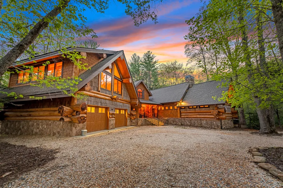 Luxury Canadian log craftsmanship in the heart of Aska Adventure Area sitting amongst lush hardwoods and on the banks of the rushing Toccoa River! Overlooking trophy trout streams with an expansive and private riverfront lot with intricate landscaping and boulder steps into the water, this custom-built mountain lodge is the quintessential mountain retreat with a sprawling back deck, outdoor lodge pole pavilion with towering stacked stone fireplace, and views up and down the Toccoa! Large oversized heated/cooled two car garage and workshop sits beneath a large linen/laundry room and pantry, and upstairs above the garage is the perfect den space with large game area, observation windows, TV/media room and half bath. Additional special features include outdoor shower, pea gravel driveway, additional loft sleeping area, and a beautiful office/work area off the primary suite. Interested parti...