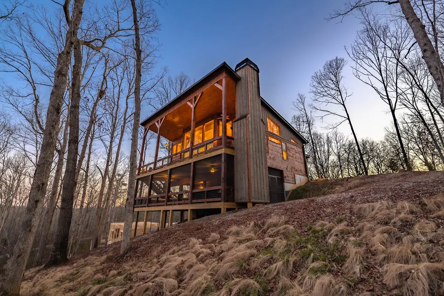 Welcome to Walking Bear Lodge! A modern rustic blend, this chalet overlooks views of the tree canopy down to Fightingtown Creek. With walls of glass in the main living room and open concept kitchen and dining, the first floor is perfect for entertaining with a door leading out to a large party porch with fireplace. Inside, cuddle up in front of the stacked stone fireplace. With two suites upstairs and an additional bunk space and bathroom on the terrace level as well as a large bar area den space. This home is perfect for either a short term rental or full time home! Terrace level deck has a fireplace, hot tub, and room for games. Complete with large carport, deeded creek access and pavilion, and less than five miles to Downtown McCaysville, this home will not last long! Call today.