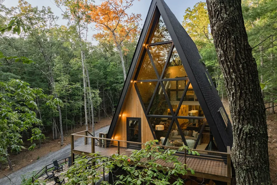 Introducing the newest masterpiece from Gnarly Home Crafters, a singular vision set against the backdrop of the Blue Ridge Mountains. This avant-garde A-frame stands out with its expansive architecture. It boasts four bedrooms, an opulent King sleeping loft, and a fluid living space, which includes a gourmet kitchen equipped with state-of-the-art appliances. An integrated coffee and liquor bar, seating for eight in the dining area, and a generous island adorned with granite countertops ensure it's an ideal venue for entertaining family, friends, and guests. Floor-to-ceiling glass panels bathe the interiors in light, evoking the whimsical charm of a treehouse. Spend your evenings beside the rock fire pit, or indulge guests with an outdoor dinner, movie, or game night on the sheltered screened porch. Ensconced behind a private gate and adjoining USFS land, a world of trails, creeks, waterf...